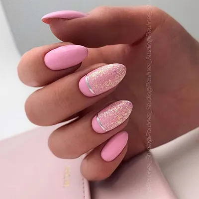 Глиттер разного размера, растяжка из блесток от кутикулы к кончику и наоборот, мелкая россыпь в замесе гель-лака — все это это как нельзя лучше смотрится с розовым. Хороший вариант — украсить крупными кусочками потали или блесток только пару ногтей, а остальные оставить матовыми или добавить другой, более сдержанный дизайн. Новинка сезона — переливающиеся хлопья с эффектом голографии великолепно дополняют нежно-розовые ногти.