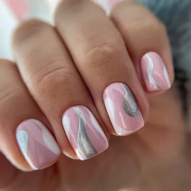 Если белый, красный и черный больше любят золото, то для розовых цветов актуальнее серебро. Хлопья потали, ленты, стемпинг и бульонки добавят искорку праздничности даже в самый простой маникюр.