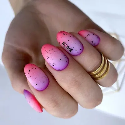 Эффект скорлупы яйца с множеством крапинок снова вошел в моду, и на сей раз он допустим не только с нюдовыми и голубыми оттенками. Различные вариации розового прекрасно дополнят хаотичные брызги. Причем возможно сочетание как темных брызг, так и светлых — главное подобрать достаточно контрастный фон.