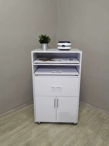Тумба предназначена для рационального хранения рабочих инструментов и продукции, используемой мастером маникюра или косметологом. Модульная конструкция включает закрытый шкафчик с дверцей и отдельный выдвижной ящик для мелкого инвентаря.
