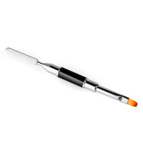 С одной стороны закреплен тонкий металлический шпатель, которым удобно набирать акрил-гель, а с другой – плотная кисточка заостренной формы, которая позволяет равномерно, быстро и аккуратно распределить средство по ногтевой пластине.
