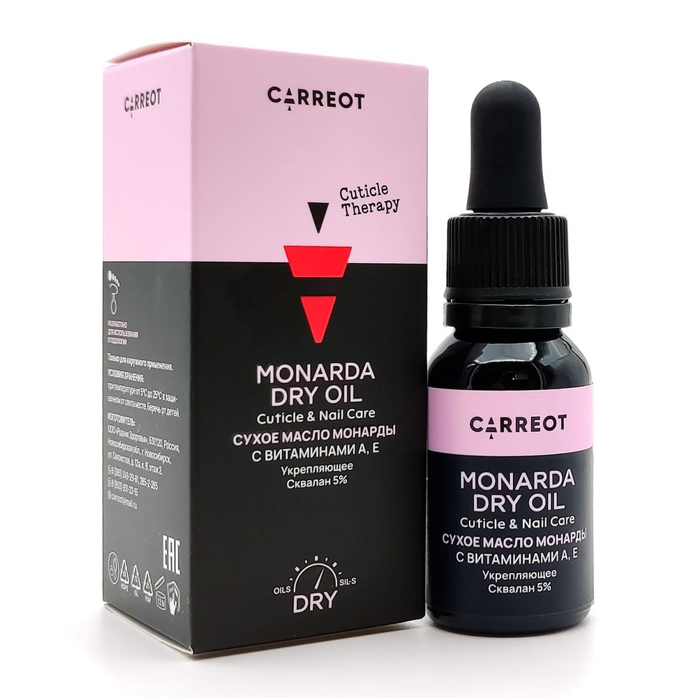 Сухое масло монарды быстро впитывается, придавая ухоженный вид кутикуле и ногтевой пластине, не оставляет жирных следов и липкости. Рекомендуется для ежедневного ухода за ломкими и поврежденными ногтями и огрубевшей кутикулой.